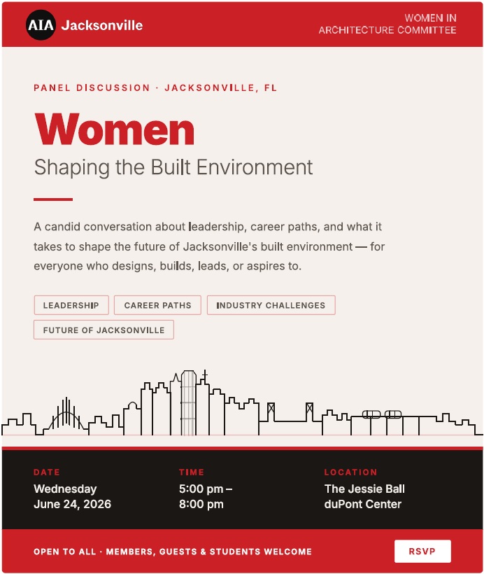 AIA Jacksonville invites you to an engaging and thought-provoking panel discussion highlighting the voices of women across the architecture, engineering, and construction industry. Featuring a diverse group of professionals—including an architect, structural engineer, contractor/project manager, and interior designer—this panel will explore how multidisciplinary collaboration drives meaningful impact in the built environment.
